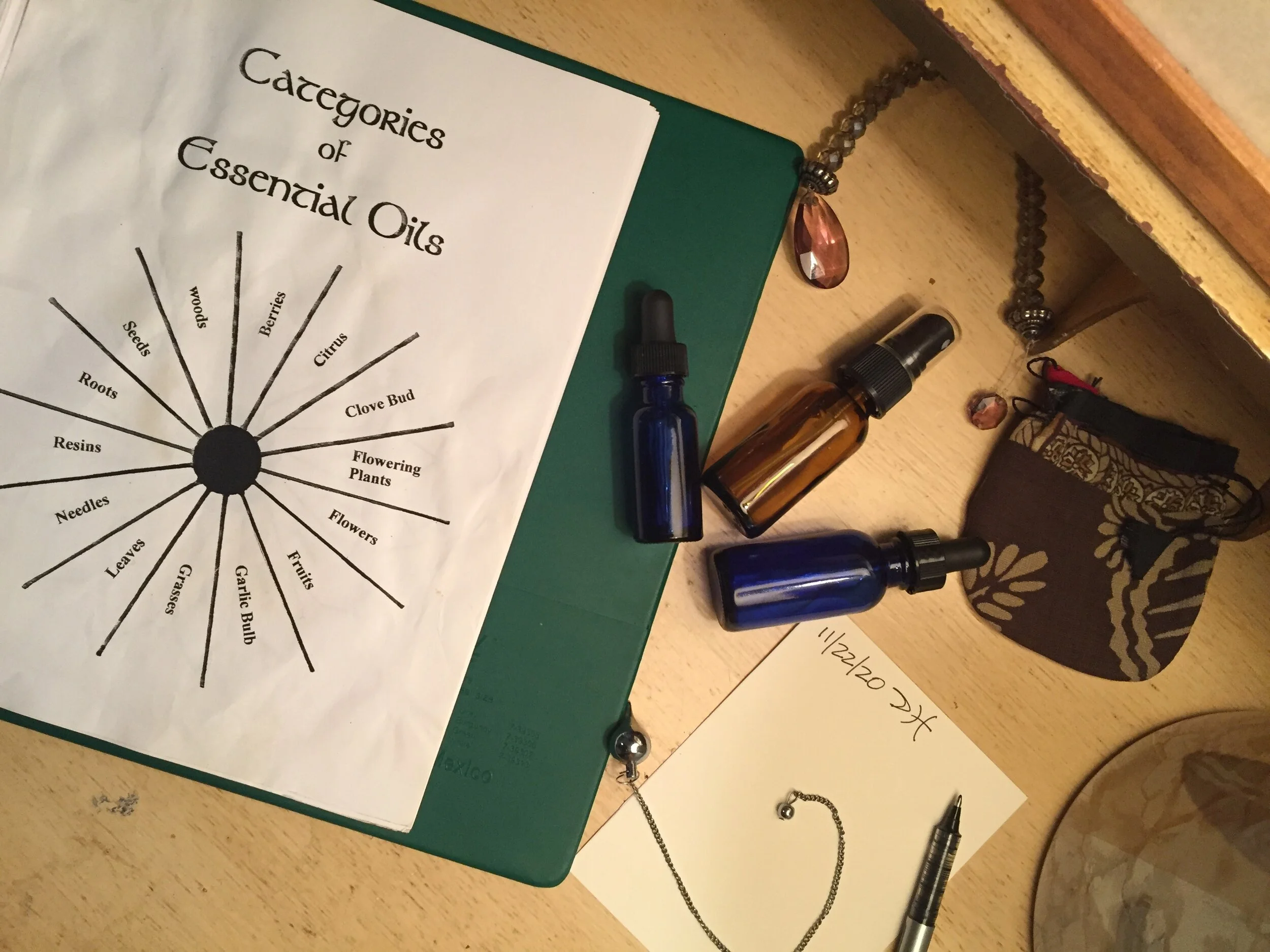 I have a series of charts that have the names of essential oils on them. I place the pendulum over the chart, and it leads me to select an oil or oils.
